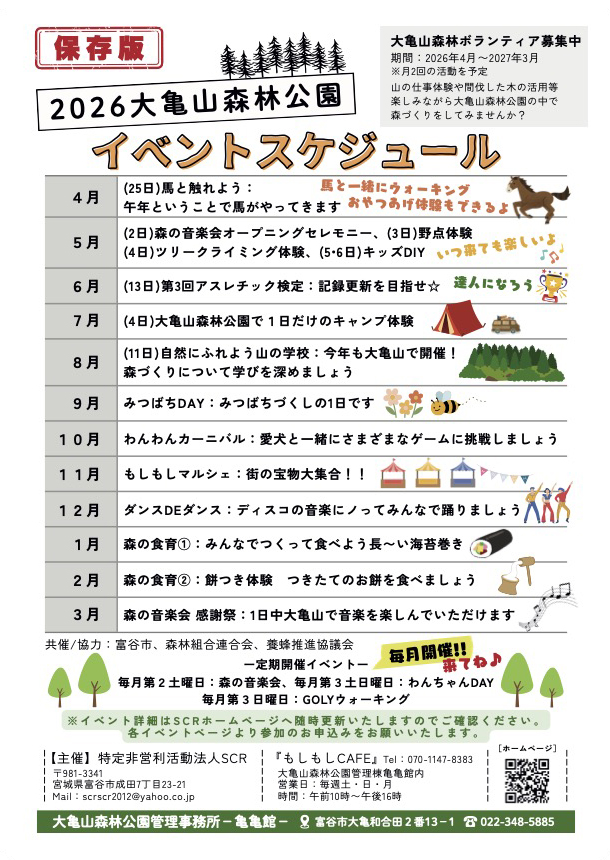 大亀山森林公園では、令和8年度の1年間を通して、活性化実証事業としてイベントを開催しています。 詳細は、NPO法人SCRのホームページをご覧ください。