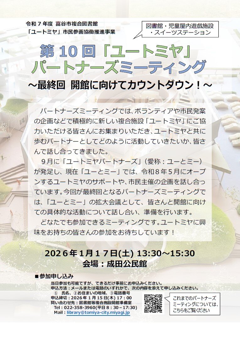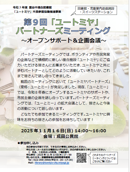令和8年春の富谷市複合図書館「ユートミヤ」オープンに向けて、ユートミヤの運営をサポートしたり、市民が自主的な企画を行うなど、ユートミヤを応援する活動を行うために、ユートミヤパートナーズ(愛称:ユーとミー)が発足しました。