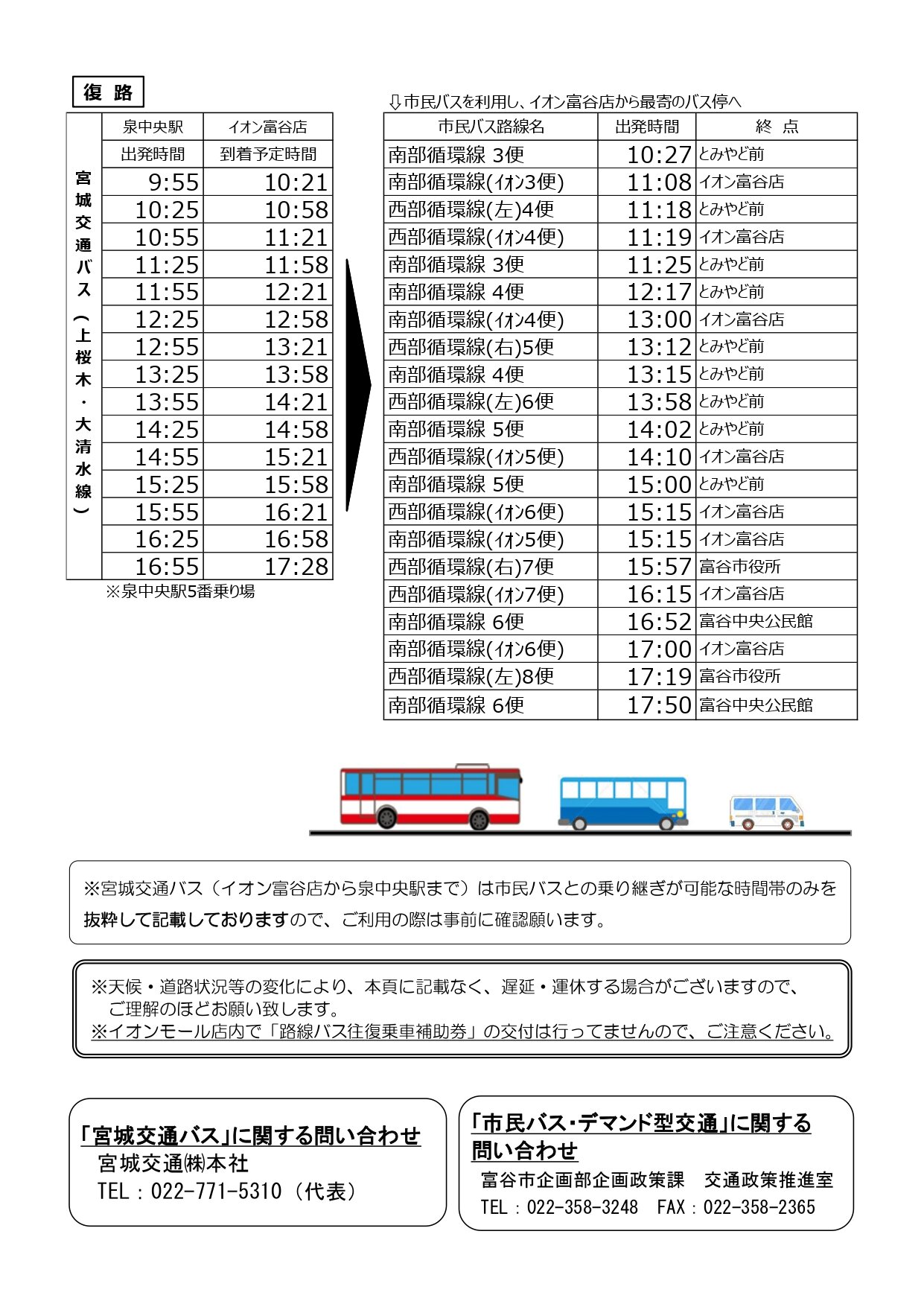 市民バスを利用し、「イオン富谷店」到着後に、宮城交通バスへ乗り継ぎ「泉中央駅」まで利用する方。