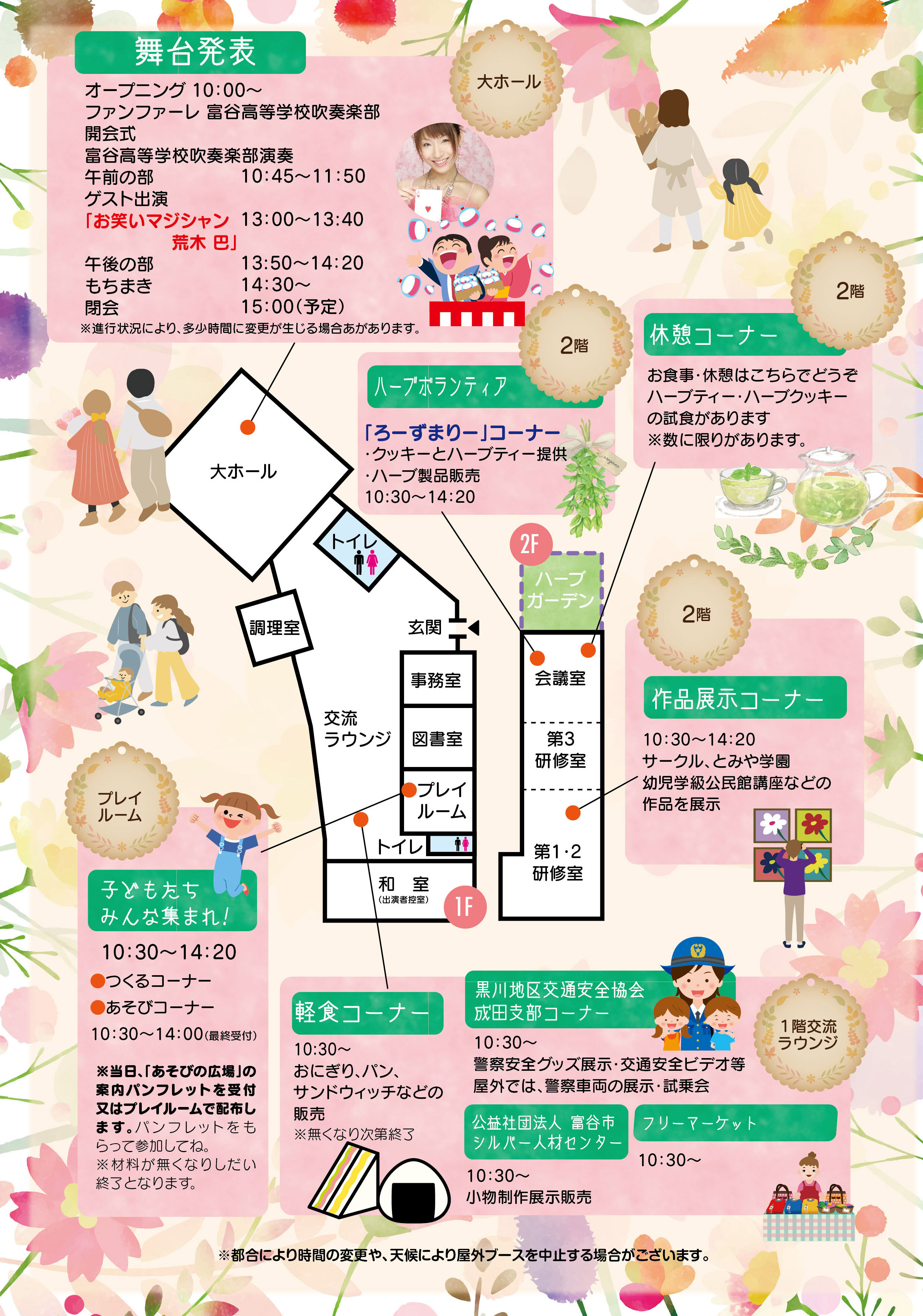公民館登録サークルや地域の皆さまの舞台発表や作品展示、子どもの遊びのコーナー、軽食コーナーなど皆さまが楽しめるイベントをたくさん用意していますので、ぜひお越しください。
