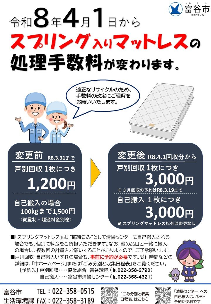 ■「スプリングマットレス」は、“臨時ごみ”として清掃センターに自己搬入される場合でも、個別に料金をご負担いただきます。なお、他の品目と一緒に搬入の場合は、複数回の計量をお願いすることがありますので、ご了承願います。