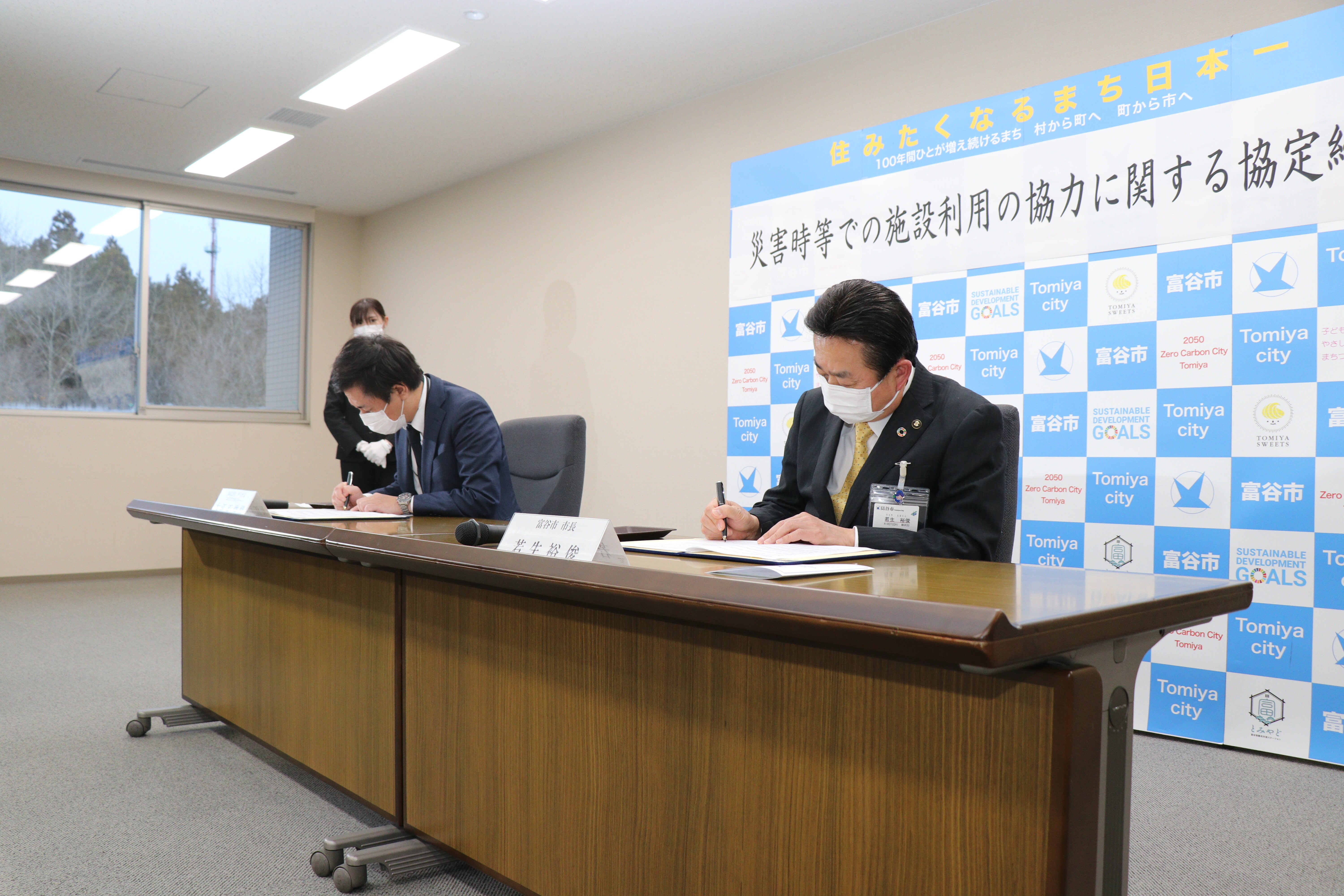 令和4年12月15日、富谷市と株式会社ダイナムとの「災害時等での施設利用の協力に関する」協定式を行い、両者で署名を取り交わしました。この協定は、災害時において市民の皆さまの安全確保を図ることを目的としています。 この協定により、車中泊避難を目的とした駐車場利用等の協力をいただくことが可能となります。