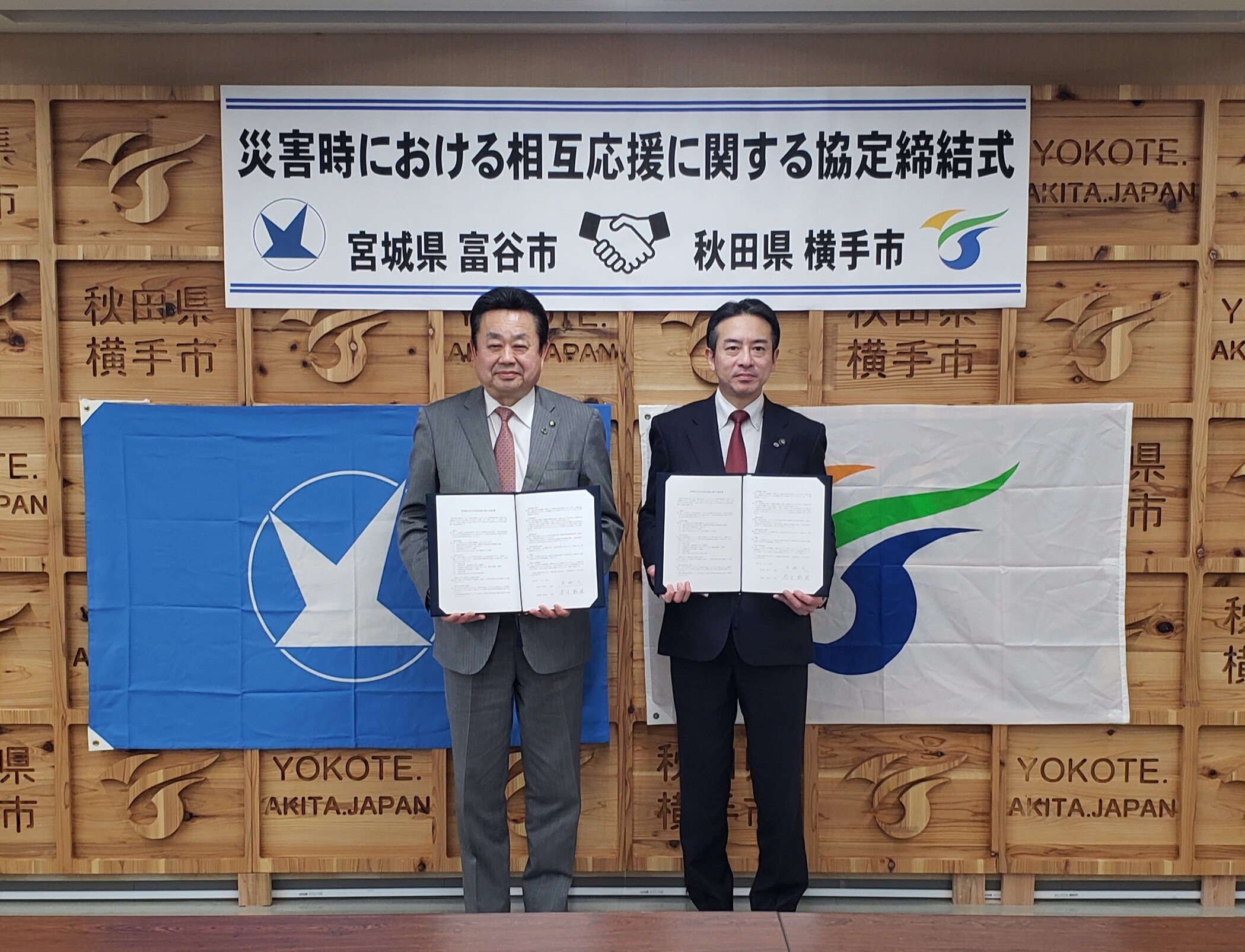 令和7年1月22日(水)、秋田県横手市役所にて「災害時における相互応援協定」を締結しました。本市が県外自治体と相互応援協定を締結するのは、愛知県長久手市に次いで2自治体目となります。協定の内容は、大規模災害が発生した際、物資や資機材等の提供及び応援職員の派遣など自治体間で相互に応援協力するものです。