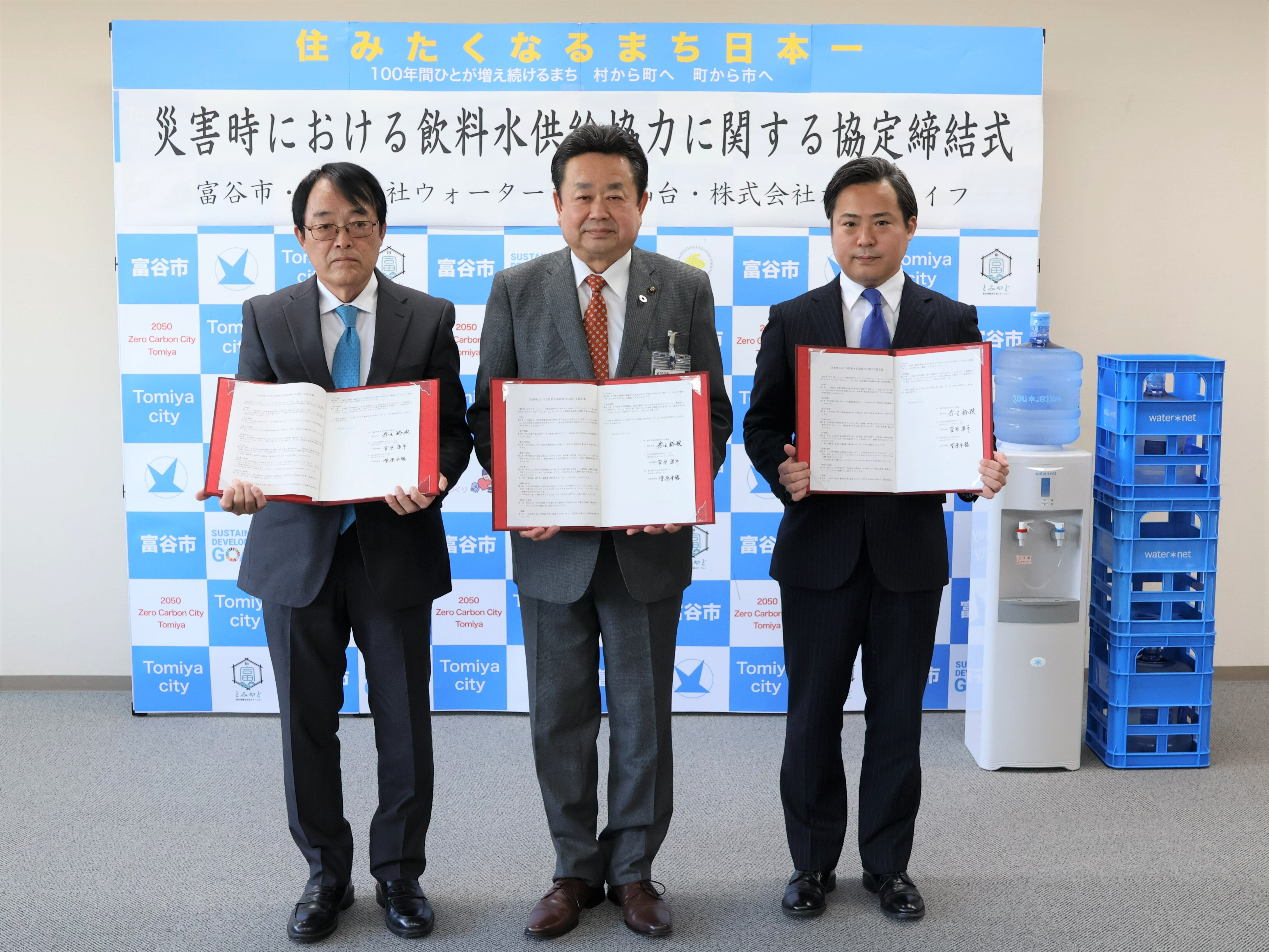令和5年12月21日、富谷市と株式会社ウォーターネット仙台、株式会社ガス&ライフの間で 「災害時における飲料水供給協力に関する 協定締結式」を行い、3者で署名を取り交わしました。この協定は、近年異常気象などによる 災害の激甚化や頻発化が進んでいることを踏まえ、 災害発生時、市民の皆さんに飲料水を安定的に供給できるよう締結するものです。これにより、大規模災害などの発生時には、 本市の要請に応じて両社が 優先的に飲料水を供給していただけるようになります。