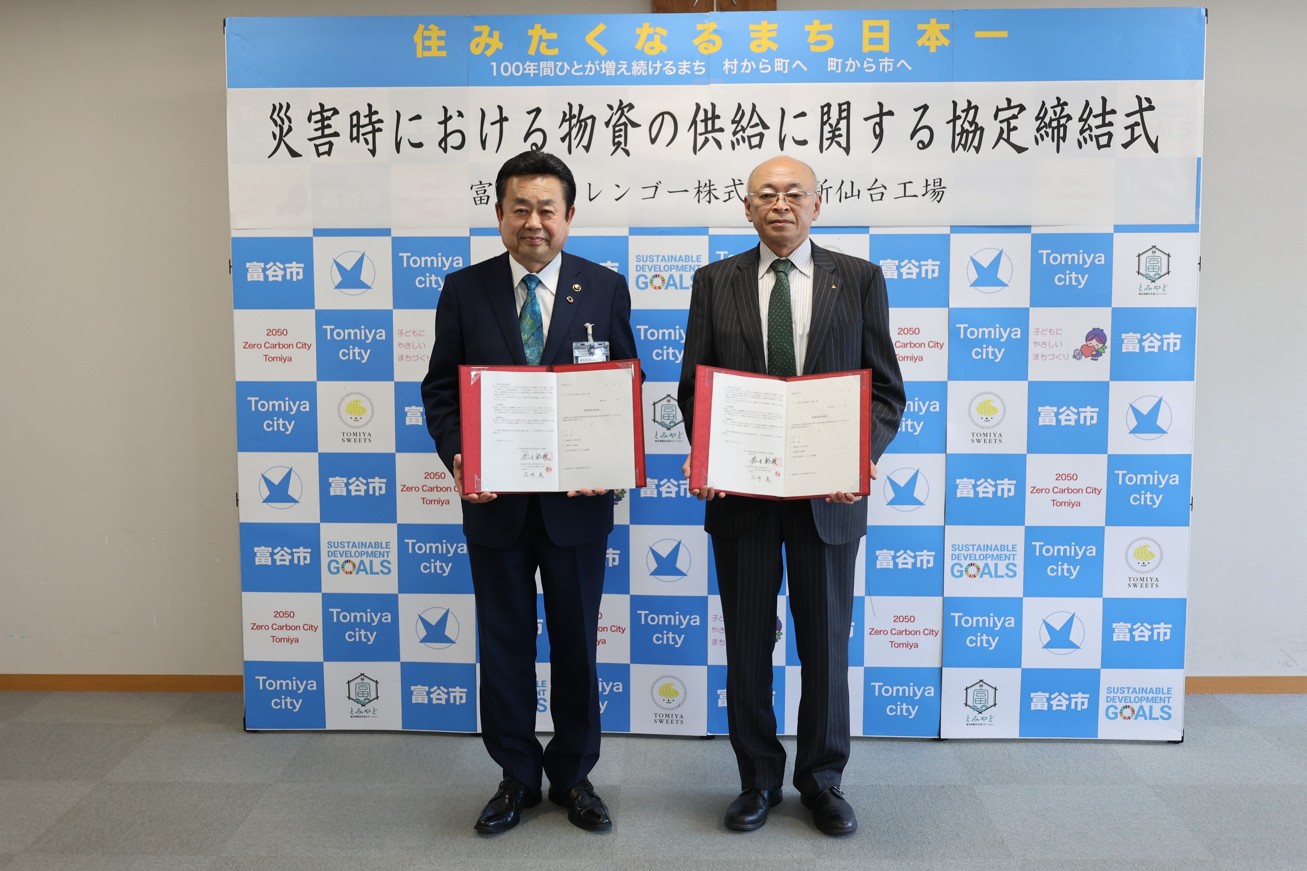 令和6年3月27日、富谷市とレンゴー株式会社新仙台工場の両者間で 「災害時における物資の供給に関する協定締結式」を行い、署名を取り交わしました。 この協定は、近年異常気象などによる 災害の激甚化や頻発化が進んでいることを踏まえ、 災害発生時、避難所生活を余儀なくされた場合において 良好な生活環境を確保するために、協定を締結するものです。 これにより、大規模災害などの発生時、 本市の要請に応じてレンゴー株式会社新仙台工場様から、 優先的に段ボール製品(段ボールベッドなど)を供給していただけるようになります。