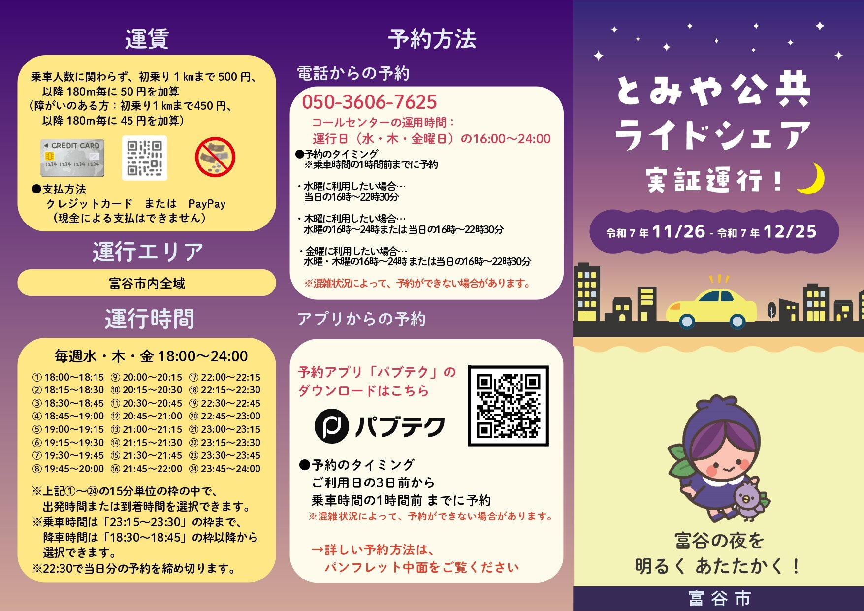 市民バスやデマンド型交通の運行終了後の夜間時間帯に市内での乗降でご利用いただけます。市内での買い物・忘年会・塾の送迎・路線バスから自宅までの交通手段として、ぜひご利用ください!