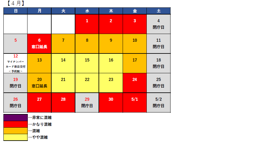 例年の状況などから、混雑が予想される日を掲載します。来庁時の参考としてご活用ください。なお、当日の天候や時間帯、手続き内容等によって、混雑状況や待ち時間が変わりますので、あらかじめご了承ください。