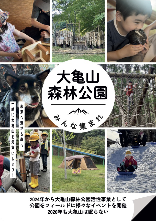 大亀山森林公園では、令和8年度の1年間を通して、活性化実証事業としてイベントを開催しています。 詳細は、NPO法人SCRのホームページをご覧ください。