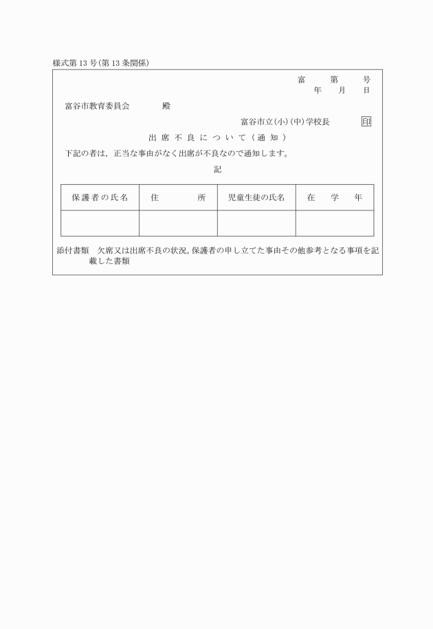 第13条 学校に在学する学齢児童又は学齢生徒が休業日を除き引き続き7日間出席せず,その他出席状況が良好でない場合において,その出席させないことについて保護者に正当な事由がないと認められるときの通知は,通知書(様式第13号)に当該学齢児童又は学齢生徒の欠席又は出席不良の状況,督促の状況,保護者の申し立てた事由及びその他参考となる事項を記載した書類を添えてしなければならない。