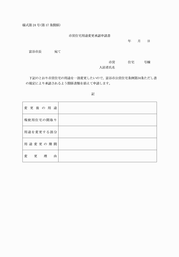 第17条 条例第34条ただし書の規定による承認を受けようとする入居者は,市営住宅用途変更承認申請書(様式第24号)を市長に提出しなければならない。