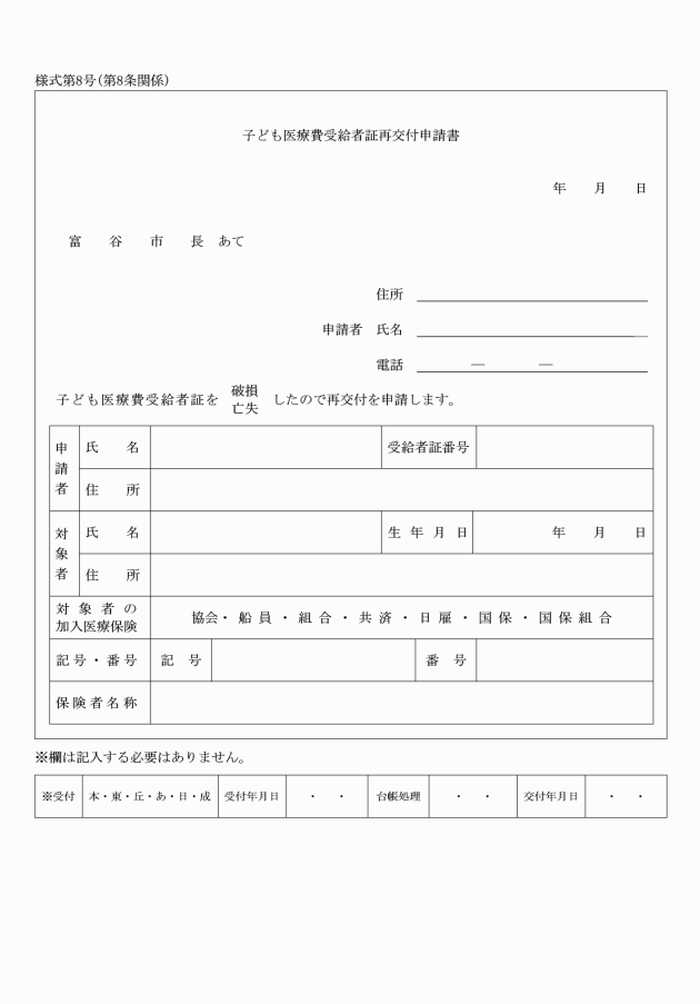 第8条 受給者は,受給者証を破損し,又は亡失したことにより,受給者証の再交付を受けようとするときは,子ども医療費受給者証再交付申請書(様式第8号)により市長に申請するものとする。