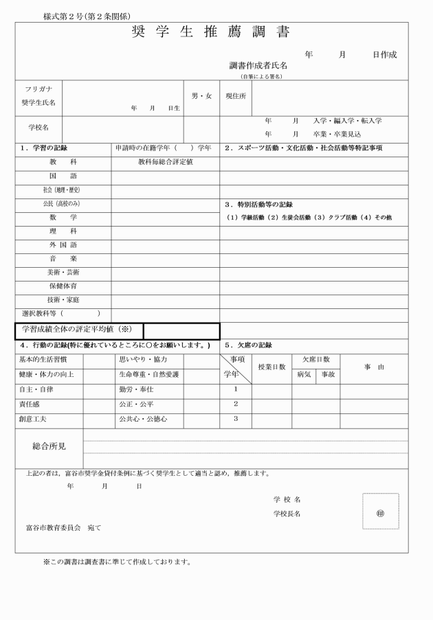 第2条 奨学金の貸付けを受けようとする者(以下「申請者」という。)は,奨学生採用願(様式第1号)に次に掲げる書類を添えて富谷市教育委員会(以下「教育委員会」という。)が定める期日までに提出しなければならない。