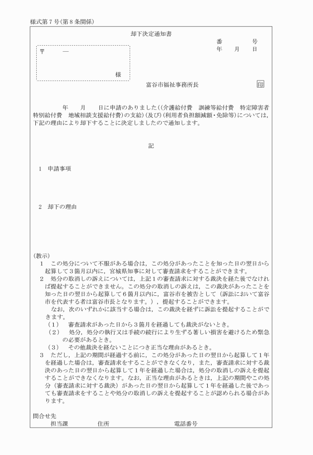 第23条 福祉事務所長は,法第53条第1項及び法第56条第1項に規定する申請を却下したときは,自立支援医療費(更生医療)申請却下通知書(様式第20号)により申請者に通知するものとする。