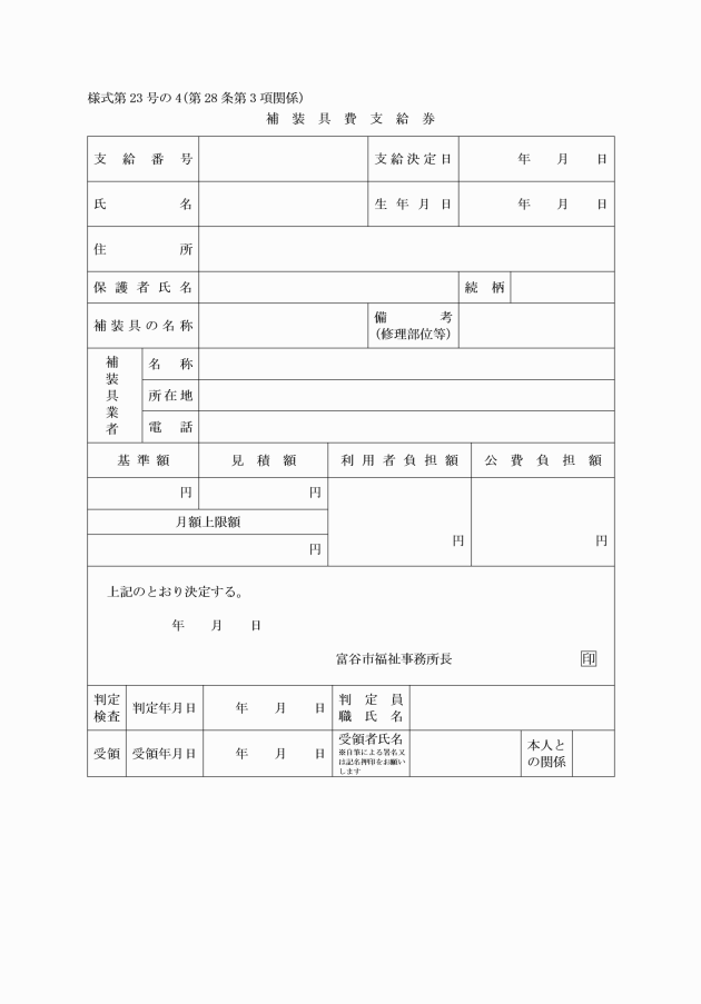 第28条 省令第65条の7第1項に規定する申請書は,補装具費(購入・修理)支給申請書(様式第23号の2)によるものとする。