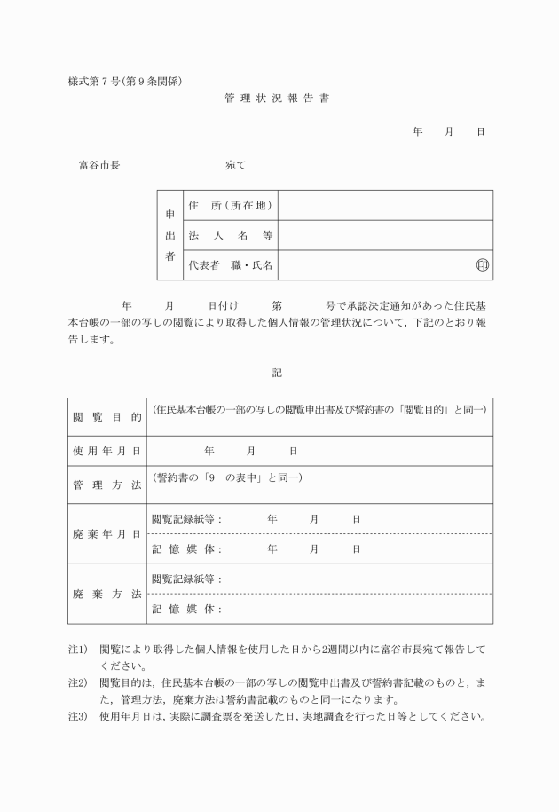 第9条 閲覧の承認を受けた者は,閲覧により取得した個人情報の管理,廃棄時期及び廃棄方法については,当該個人情報を使用した日から2週間以内に管理状況報告書(様式第7号)により市長宛て報告しなければならない。