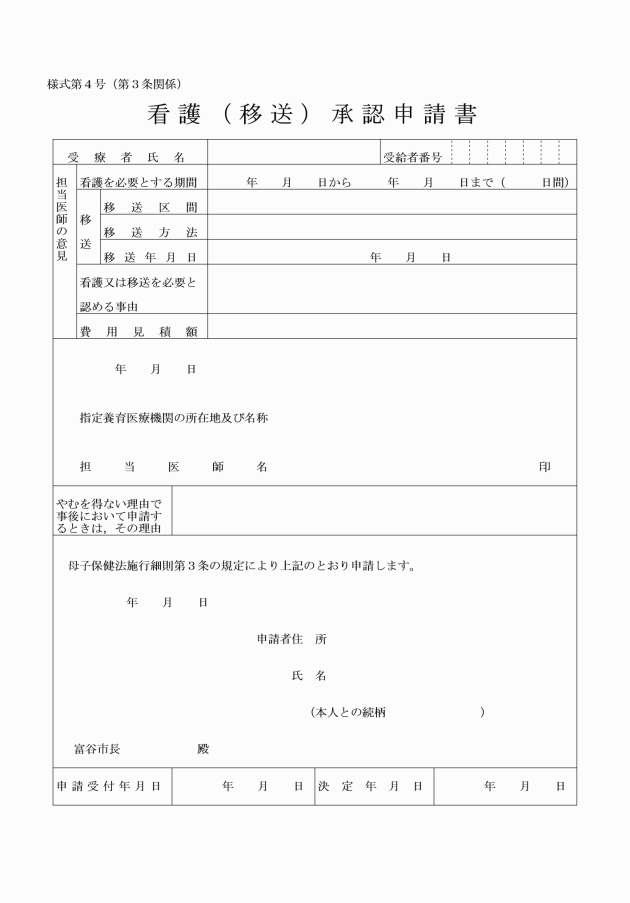 第3条 法第20条第1項に規定する養育医療の給付に代えて当該養育医療に要する費用(看護又は移送に要する費用に限る。)の支給を受けようとする者は,看護(移送)承認申請書(様式第4号)により事前に市長の承認を受けなければならない。