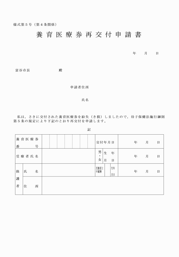 第4条 省令第9条第2項に規定する養育医療券を紛失し,又は毀損した者は,養育医療券再交付申請書(様式第5号)により再交付の申請をすることができる。