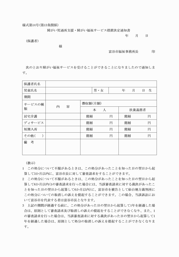 第13条 福祉事務所長は,法第21条の6の規定による措置を講じることを決定したときは,別記様式第14号により当該障がい児の保護者に通知するものとする。