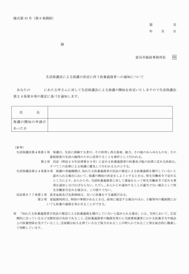 2 法第24条第8項の規定により明らかに扶養義務を履行することが可能と認められる扶養義務者に対し,要保護者の保護の開始について通知するときは,生活保護法による保護の決定に伴う扶養義務者への通知について(様式第33号)によるものとする。