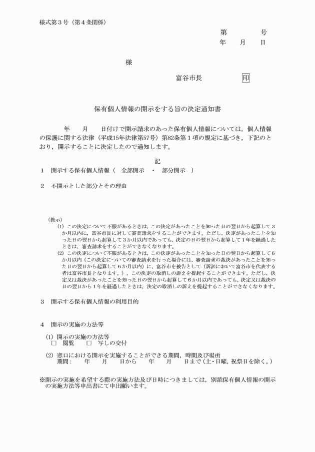 第4条 法第82条第1項の規定による通知は,保有個人情報の開示をする旨の決定通知書(様式第3号)によるものとする。