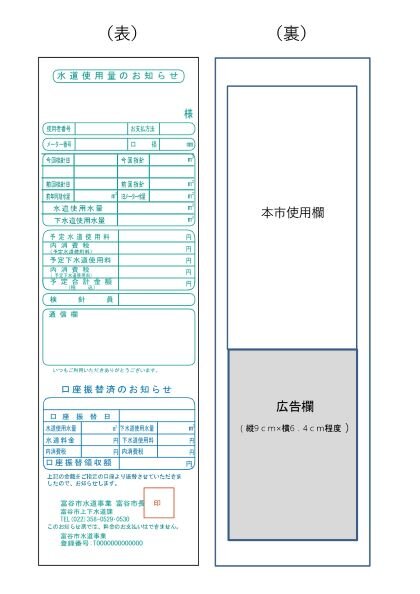 富谷市水道事業では、新たな財源を確保するため、毎月の水道メーター検針の際に配布している『水道使用量のお知らせ(水道検針票)』裏面の広告を募集します。